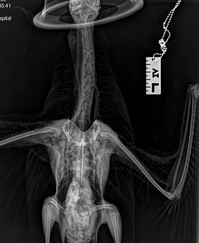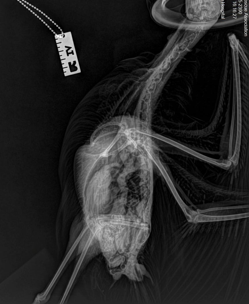 The WRA team managed to successfully remove the skewer and rehab the gull. X-ray images below show the positioning of the skewer (even though the gull almost removed it on its own!). The following two images are the before and after radiographs. If you look closely enough you can see all the scar tissue it caused.